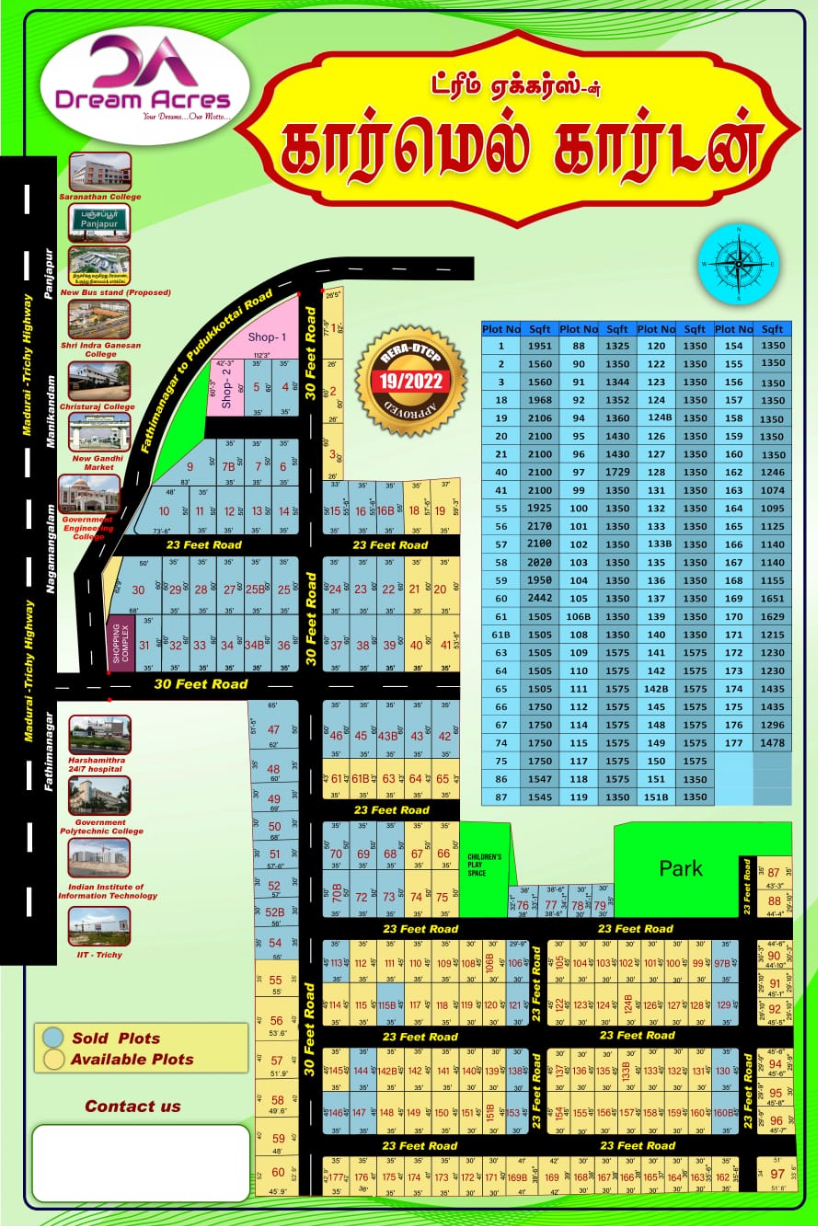 Carmel Garden layout is located at Trichy. It is DTCP and RERA approved, with financing options available. It is well-connected with nearby facilities such as the , and several other excellent amenities.