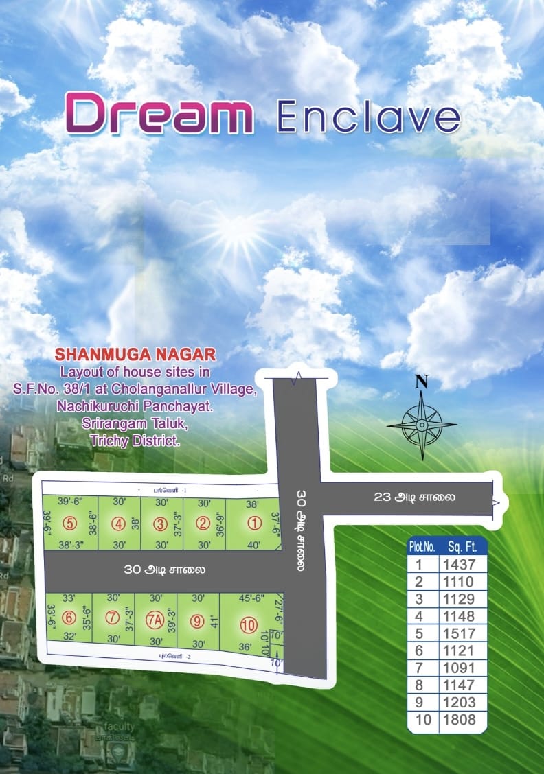 Dream Enclave layout is located at Cholanganallur village, Nachikurichi Panchayat, Srirangam taluk, Trichy.. It is DTCP and RERA approved, with financing options available. It is well-connected with nearby facilities such as the , and several other excellent amenities.